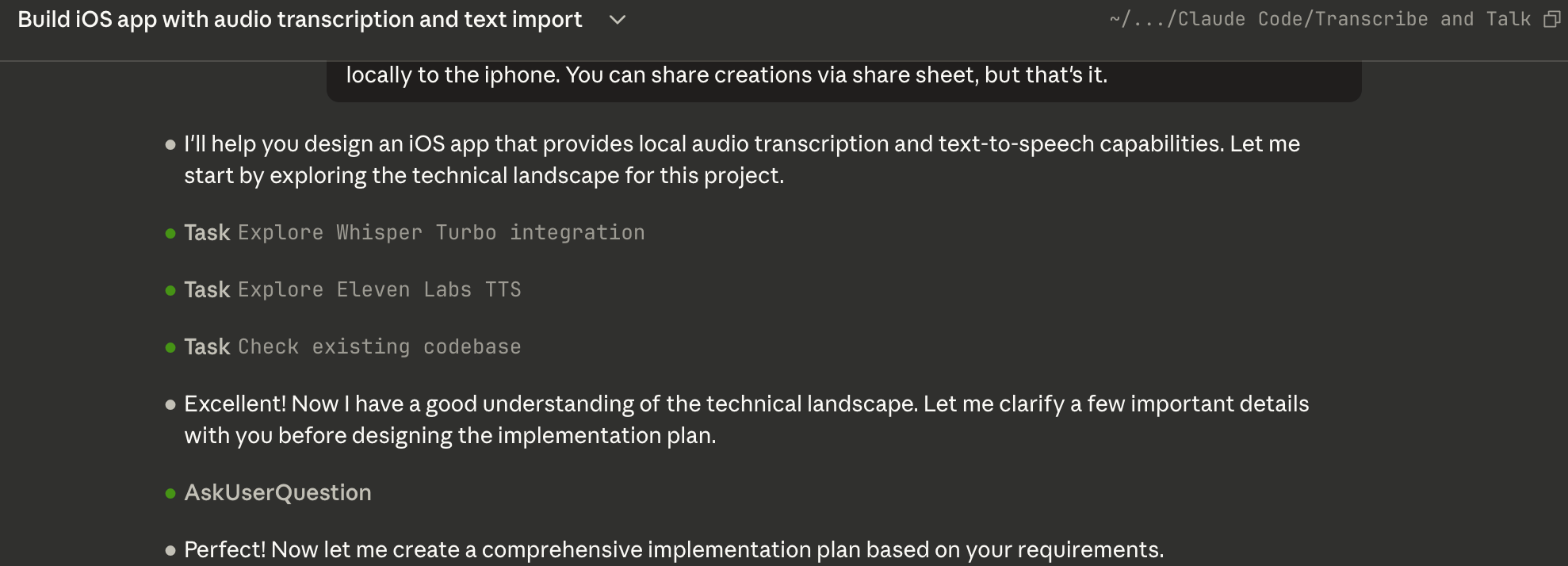 In a few tries with a few following guidance prompts, it made an MVP of this. I was able to build it in Xcode (I have an Apple developer account from my previous attempts) and launch it on my iPhone. Upon further refinements, I will soon have a TestFlight (beta test) for what I'm tentatively calling Transcribe and Talk for iOS devices, which you can sign up for here.