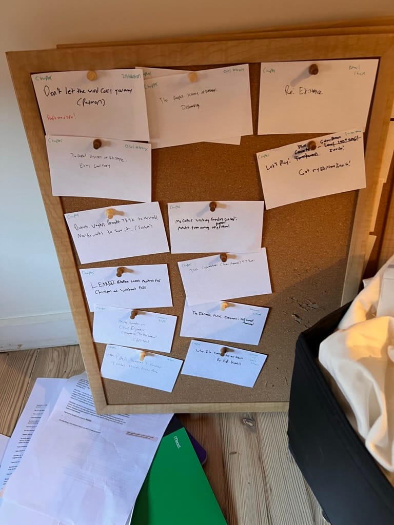 In 2021, I walked a mile and a half to the Artist and Craftsman Supply (once in Park Slope, now in Sunset Park) to buy a few cork boards, some index cards, and a bunch of push pins. For the next few months, I plotted out the book, developed characters, and generally figured out how everything would weave together (or if/why they would). I have no problem showing you one of these boards, currently sitting in my attic, as none of it makes sense to anyone but me at the moment and my handwriting is atrocious.